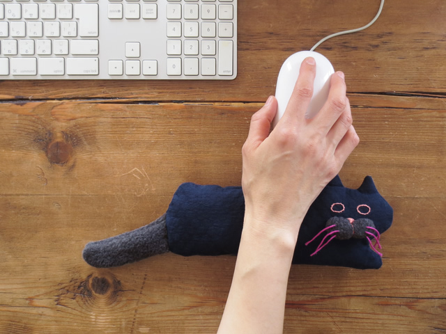 | 長くてふこふこのネコ「Stickitten」です。 ぬいぐるみ、インテリアの色添えとして楽しんでいただく他、キーボードやマウスで酷使しがちな手首をやさしくサポートするリストレストとしてもお使いいただけます。 |
